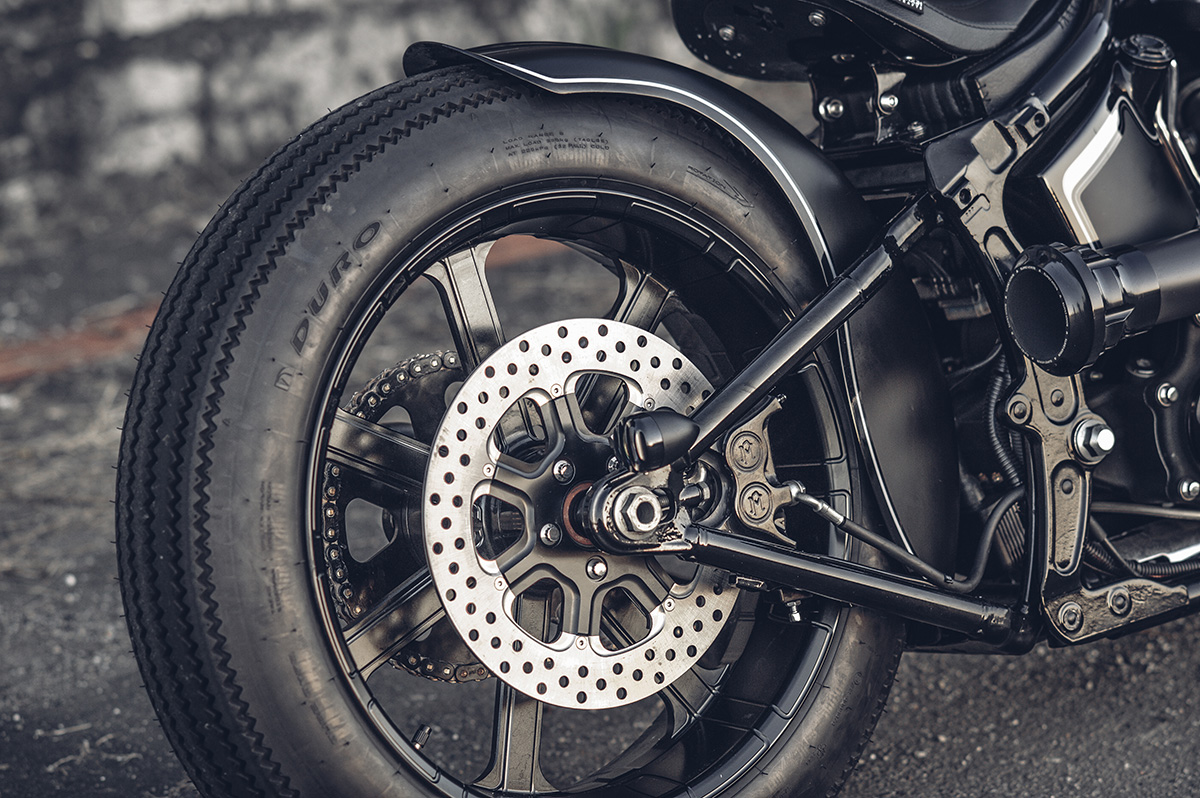 Upgrade zestawu hamulcowego objął montaż dwóch 6-tłoczkowych zacisków Performance Machine z przodu i 4-tłoczkowego zacisku z tyłu. Oba zamontowano na obręczach Arlen Ness z oponami Firestone. Sprzęt hamujący, nie skręcający, ale gdyby ktoś szukał zwinnej maszyny, nie patrzyłby przecież w kierunku Softaila!