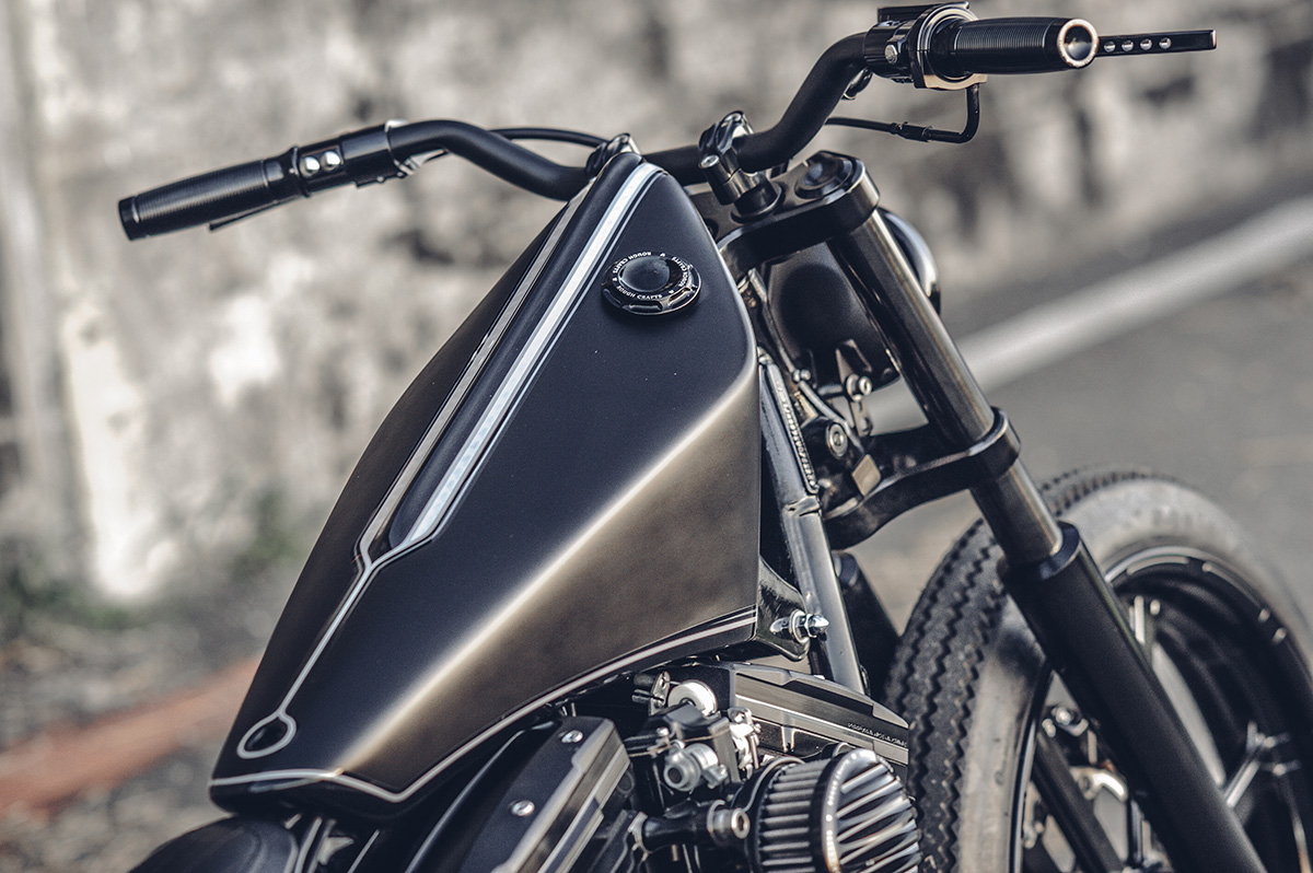 Dla zdrowego oddechu i odpowiedniego brzmienia V-ki, zastosowano sportowy filtr powietrza i customowy układ wydechowy, a dla podkreślenia czarnego charakteru, Softail został pomalowany i ozdobiony delikatnymi szparunkami przez Air Runner Custom Paint.