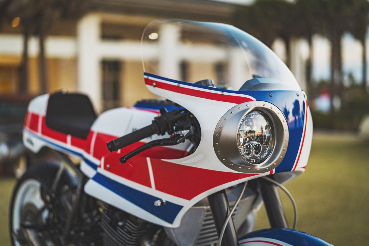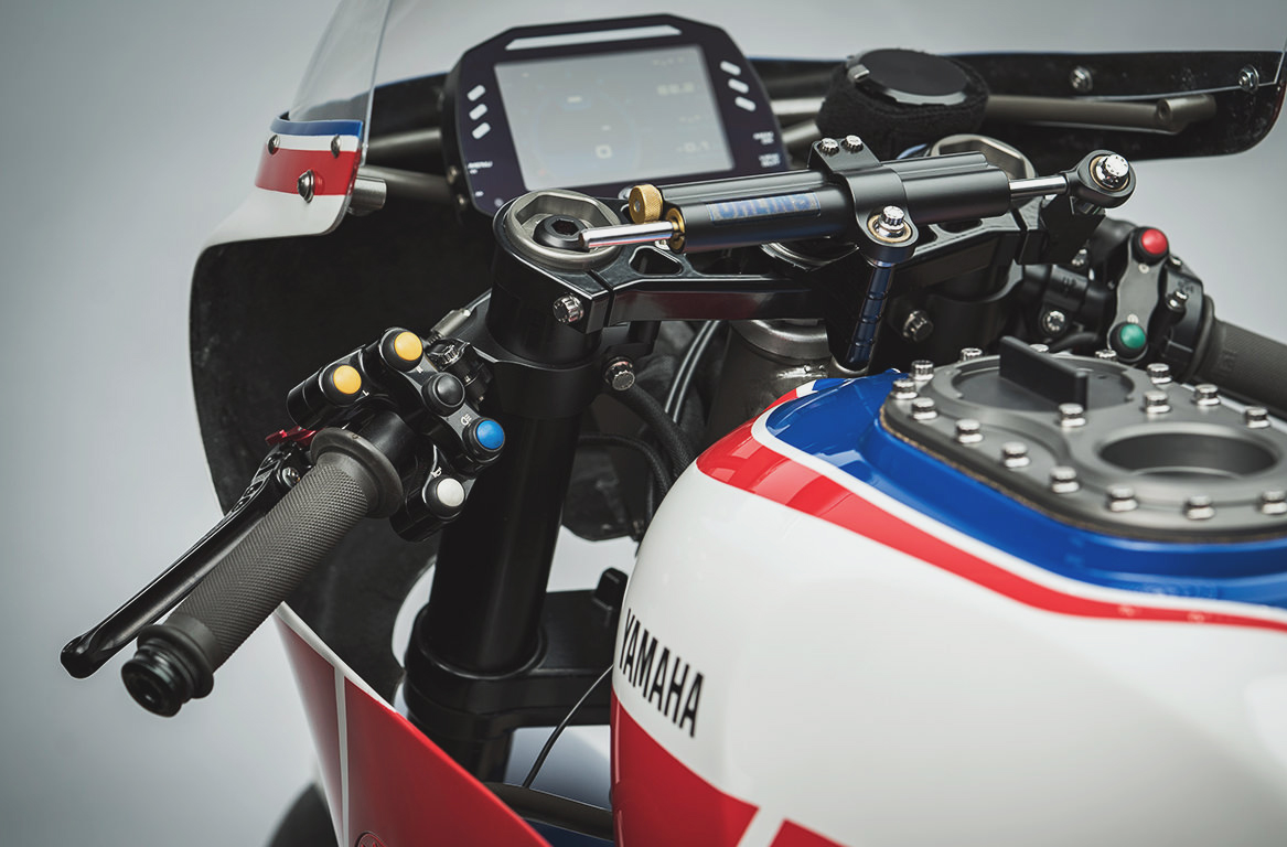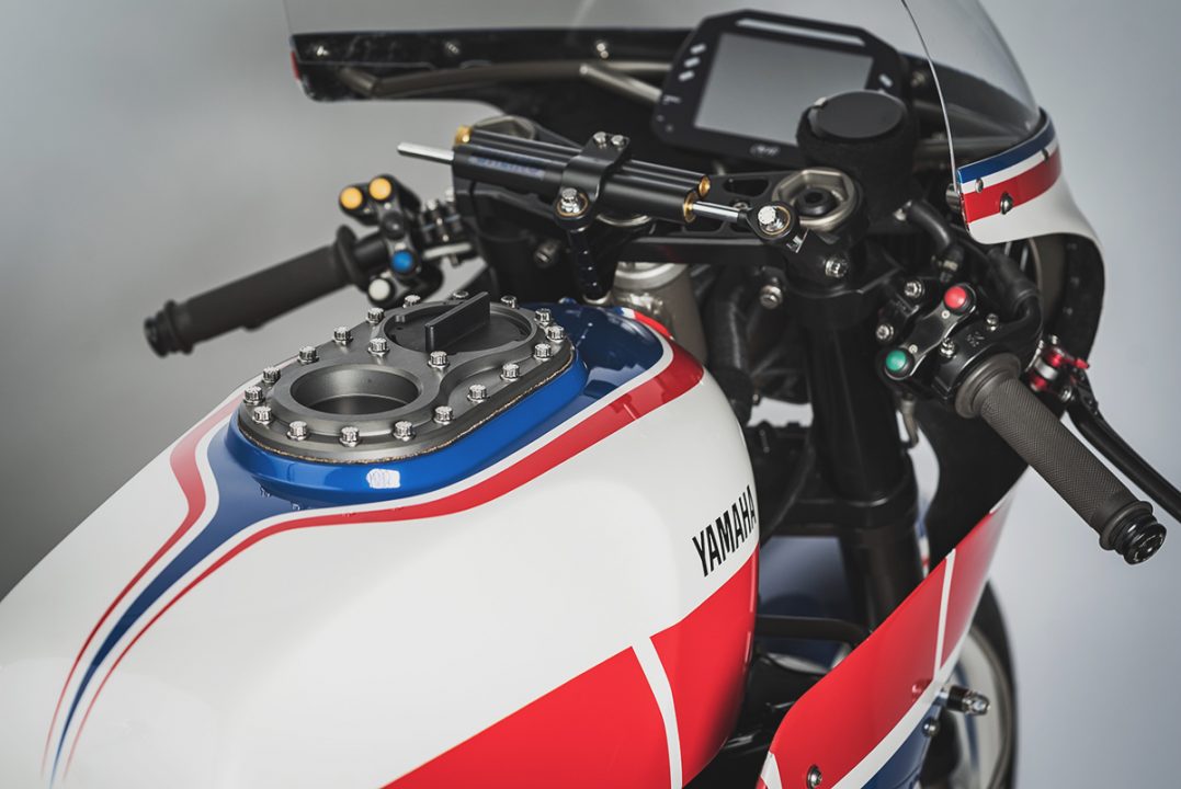 Przednia owiewka to model F1FU z oferty Airtech Streamlining. Oczywiście mocno zmodyfikowany, bo jakże mogłoby być inaczej w tak kompleksowym projekcie. Pojedynczy reflektor pochodzi z JW Speaker LED i jest przesunięty na prawą stronę, tak jak w wyścigowym XJ750R.